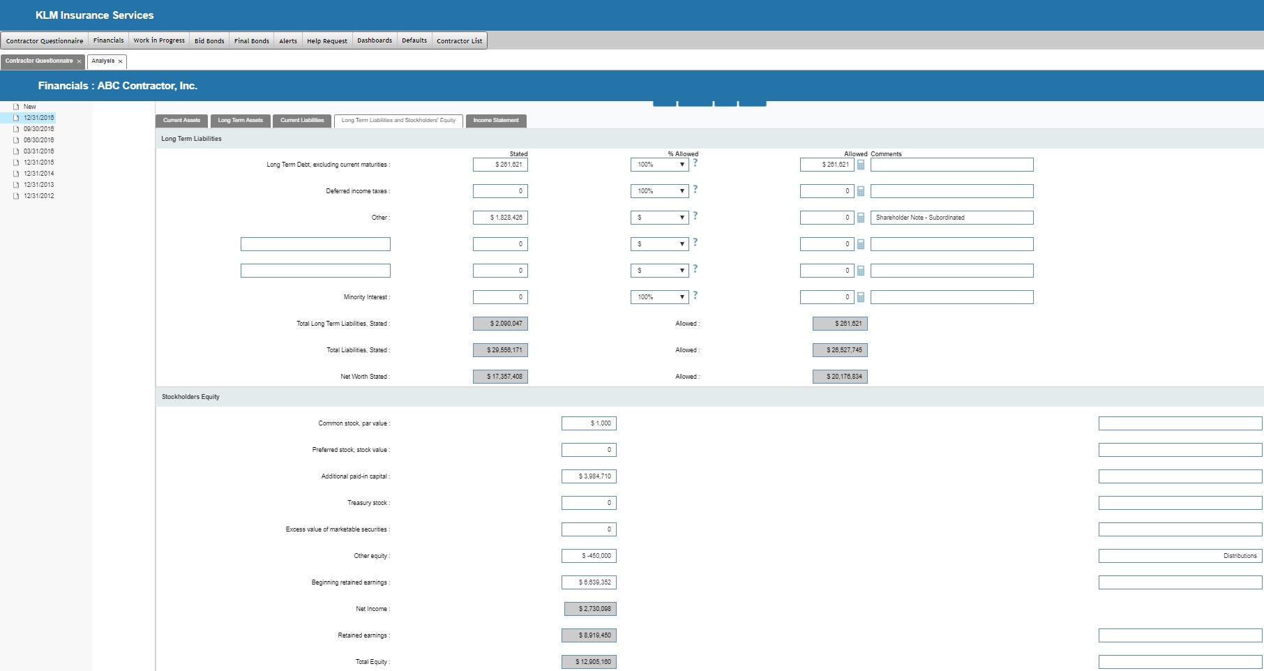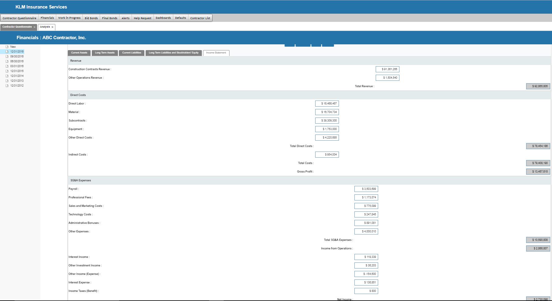 The Financial Module allows the user to underwrite client’s financial information on a secure easy-to-use system that mirrors many of the credit modeling systems utilized by today’s top surety companies. The user can generate instant exclusive, flexible and credible financial reports with in-depth analysis including comparative analysis. Another unique feature of this Module is the ability to generate industry benchmarking reports that compares your clients’ performance side-by-side with peer groups.